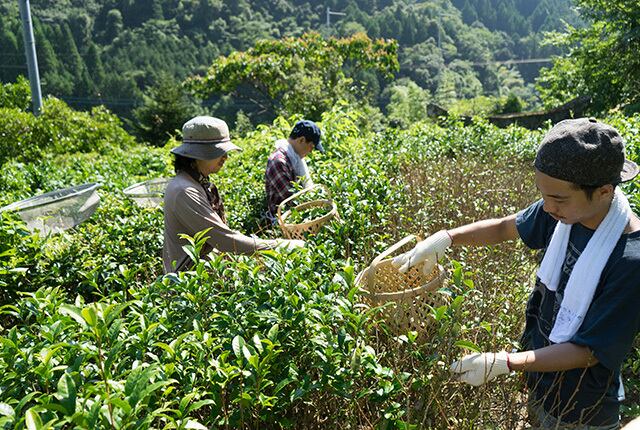 茶葉が大きく成長した7月頃に茶摘みを行います。新芽だけでなく厚く成長した茶葉すべて摘んでいきます。